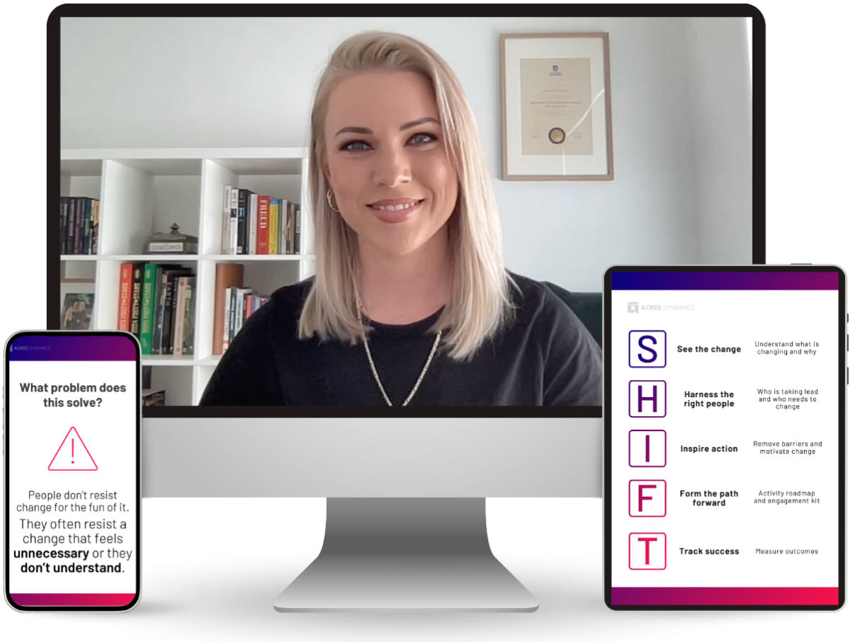 - 2 hour live workshop led by a change and behavioural practitioner from Acres Dynamics.